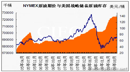 圖為NYMEX原油期價與美國戰略儲備原油庫存走勢圖。(圖片來源:北京中期)
