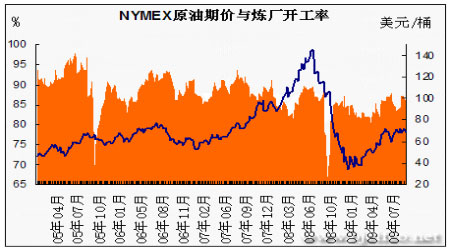 圖為NYMEX原油期價與煉廠開工率走勢圖。(圖片來源:北京中期)