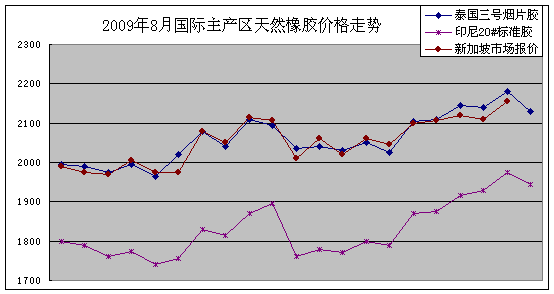 根據(jù)農(nóng)業(yè)部農(nóng)墾局(農(nóng)業(yè)部發(fā)展南亞熱帶作物辦公室)監(jiān)測(cè),2009年8月份泰國(guó)3號(hào)煙片膠(RSS3)和印尼20號(hào)標(biāo)準(zhǔn)膠(SIR20)價(jià)格延續(xù)上月末走勢(shì)繼續(xù)上揚(yáng),全月呈振蕩攀升的態(tài)勢(shì)。而國(guó)內(nèi)產(chǎn)銷兩地國(guó)產(chǎn)5號(hào)標(biāo)準(zhǔn)膠(SCR5)現(xiàn)貨價(jià)格沒有跟隨國(guó)外天然橡膠走勢(shì),全月在相對(duì)高價(jià)區(qū)域里窄幅波動(dòng)。產(chǎn)銷兩地成交清淡,成交量與上月相比有所增加。