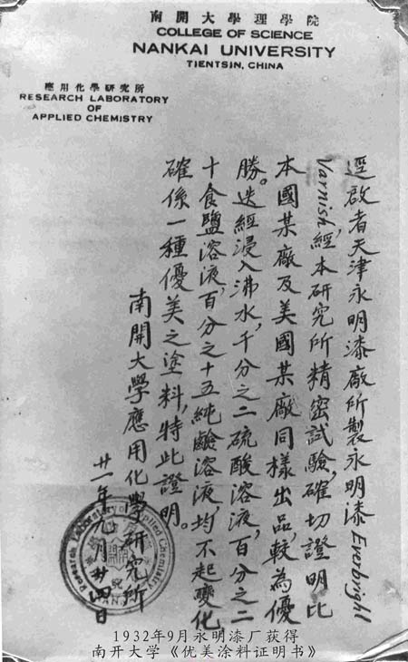 30年代-永明漆廠獲得南開大學的《優美涂料證明書》