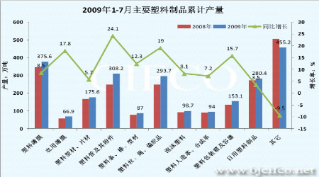 圖為2009年1-7月各類塑料制品累計產量及增長率走勢圖。(圖片來源:中國工信部 卓創資訊 單位: 萬噸,%)