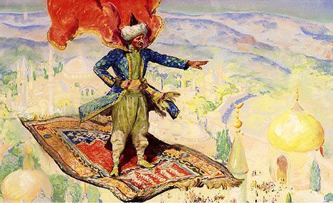 周末坐在客廳的沙發(fā)上,雙腳踩著一條絳紫色漩渦花紋編織地毯在客廳看電視劇;廣告的空擋,蹬上地毯去廚房拿瓶啤酒;電視劇結(jié)束,蹬上地毯出門透口氣。你只需要站在地毯上,彎曲雙膝,靠身體的傾斜控制飛行的方向。而飛行的距離、高度、乘客的體重、飛毯前進(jìn)時(shí)振動(dòng)的幅度都事前計(jì)算好了,不用擔(dān)心司機(jī)是剛拿到本兒的新手,不用擔(dān)心耗油,不用擔(dān)心超速和堵車,也不用擔(dān)心沒有停車位,唯一要擔(dān)心的就是自己的衣服和地毯的顏色是否搭配。