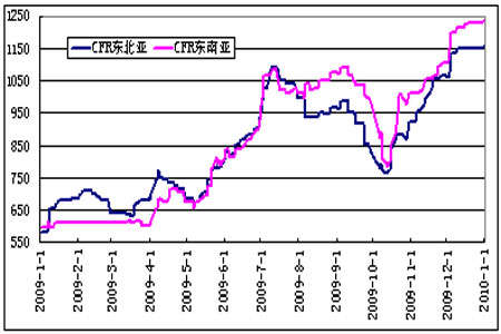 LLDPE是乙烯與少量高級α-烯烴(如1-丁烯、1-己烯、1-辛烯等)在催化劑作用下,經高壓或低壓聚合而成的一種共聚物,因此,乙烯的價格走勢對LLDPE的成本起著至關重要的作用。我國目前的乙烯自給率僅在40%左右,導致其不能完全滿足國內市場的需要,缺口部分主要從亞洲市場進口。作為原油的下游裂解產品,乙烯價格與原油的價格走勢緊密相關。受上游原油價格大幅回升影響,09年全年亞洲乙烯價格自年初的575-590美元/噸CFR東北亞和590-605美元/噸CFR東南亞大幅上漲至年末的1150-1152美元/噸CFR東北亞和1228-1229美元/噸CFR東南亞,漲幅分別達到98.6%和106.7%。根據最新統計,2010年的3-6月份,亞洲地區裝置檢修集中,因此,乙烯供應有望持續緊張,加上上游原油維持漲勢,2010年乙烯市場仍將堅挺,LLDPE生產成本仍將繼續增加,對LLDPE期價形成強力支撐。