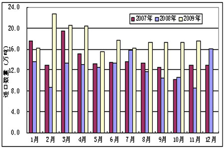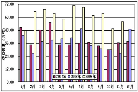 由于我國PE內需較大,加上我國生產的PE產品品種和質量無法參與國際競爭,所以出口量很小,我國是屬于一個PE凈進口大國。我國也是世界上LLDPE最大的進口國和第二大消費國。在年初原油價格處于低位時,較低的PE進口價格引發了PE進口量的大幅增加,LLDPE進口量也相應增加。在年中原油價格大幅上漲之后,進口PE價格也大幅上揚,PE進口量逐月回落,LLDPE進口量也回落至17萬桶附近企穩。2009年1-11月PE累計進口量為676.08萬噸,較2008年同期增加82.82%。2009年1-11月LLDPE累計進口量為198.66萬噸,較2008年同期增加51.09%。