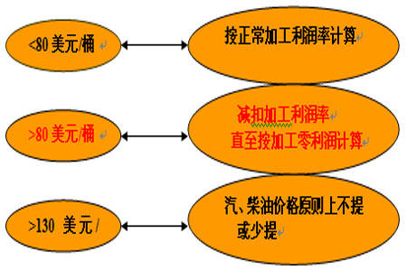 當前國際原油現已超80美元,那么當國家欲上調國內成品油零售價格時,必將把“減扣加工利潤率,直至按加工零利潤計算”作為補充增加的參考條件。其煉廠的生產的成本隨國際原油上行而升高,那么其利潤空間將相應下降,煉廠的生產積極性也將有所降低,但從宏觀考慮,為避免過高的油價抑制其經濟的復蘇及發展,故此減扣一定利潤率。