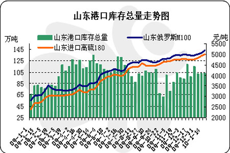 圖為山東沿海港口燃料油庫存走勢圖。(圖片來源:金銀島)