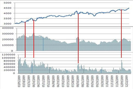 圖為上海燃料油期貨09年價格、成交量和持倉量變化圖。(圖片來源:格林期貨)