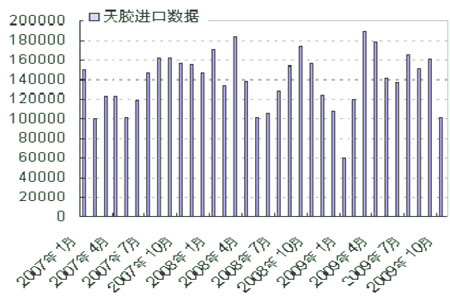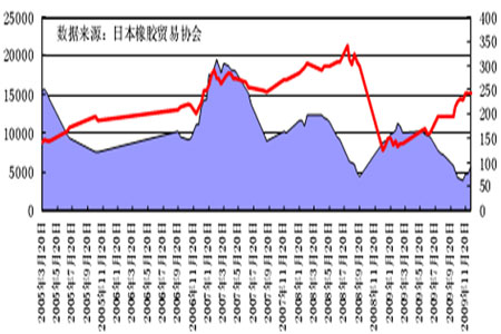 2009年上海膠市天膠庫存量呈現(xiàn)先減后增的劇烈變化趨勢,并由年初6.5萬余噸增加至12月中旬的13萬余噸。而國外的天膠庫存則基本是屬于相反的走勢,日本的天膠庫存09年則是呈現(xiàn)出先增后減的變化趨勢。由此在不考慮其他因素的前提下,就天膠高庫存量對滬膠的影響而言,目前呈現(xiàn)出抑制價格上揚的作用,但考慮到日本的天膠庫存處于歷史低位,若后期隨著經(jīng)濟的進一步好轉(zhuǎn),國內(nèi)外對天膠的需求將呈現(xiàn)復(fù)蘇和上升的趨勢,這樣國內(nèi)的高庫存對價格的抑制作用在2010年料將不斷弱化。