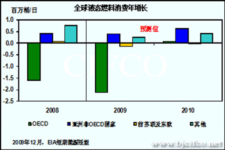 在2009年度EIA最后的一個月的報告中,其預測2010年全球原油消費增加110萬桶至8522萬桶/日,EIA在最近的幾次月度報告中,總體上在不斷上調2010年的全球原油消費增長,而這個消費增長主要來自于亞洲非發達國家,包括中國、印度等消費的增長。OECD國家在經過2008年和2009年消費量的較多下降之后,2010年消費實現正增長,但增長幅度不大。EIA的報告并稱,2010年OPEC國家的石油產量將有較多的增長,因需求增加及油價走高,而其他地區的產量總體變化不會太大。