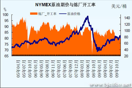 圖為NYMEX原油期價與煉廠開工率走勢圖。(圖片來源:北京中期)