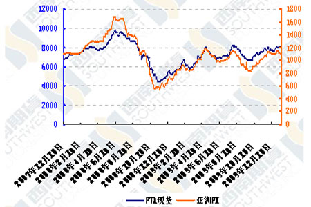 圖為PTA現貨價及上游PX價格走勢圖。(圖片來源:西南期貨)
