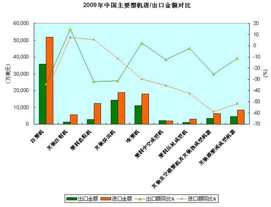 2009年,中國累計(jì)出口塑機(jī)近3.2萬臺(tái),金額為7.6億美元;同期進(jìn)口8315臺(tái),金額12.6億美元。除塑料中空成型機(jī)出口額略高于進(jìn)口額外,其他類別塑機(jī)外貿(mào)均為逆差。