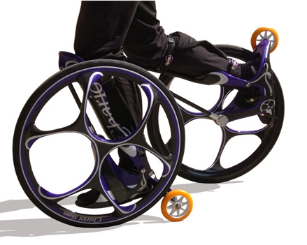 由澳大利亞人邁克爾.詹金斯(Michael Jenkins)發(fā)明的這款新型輪滑鞋,將滑冰和自行車的功能集于一身。這個輪滑鞋的裝置模仿人們騎自行車的原理:首先將輪滑者的雙腳和膝蓋固定在一根軸上,然后讓雙腳踩在輪內(nèi)側邊安裝的鞋內(nèi),利用膝蓋帶動雙腳,從而帶動雙輪轉動,雙腳后跟各裝有一個小滑輪保持穩(wěn)定性。當雙腳帶動輪子向前轉動時,滑輪者可以體驗到滑雪和溜冰的速度感。詹金斯介紹說,相比傳統(tǒng)旱冰鞋,這款輪滑鞋的重心更低,不僅使得輪滑者能滑得更快,而且操作性更強。詹金斯舉例說,自己曾經(jīng)一次試滑可以達到每小時12英里,而且中間沒有間斷。不僅如此,這款輪滑鞋還可以在草地上滑行,或者帶領人們穿越崎嶇的地形。剎車的方法有兩種,可以用雙手抓住車輪剎車(當然雙手要佩戴特制手套),或者用腳做一個T字型剎車動作。