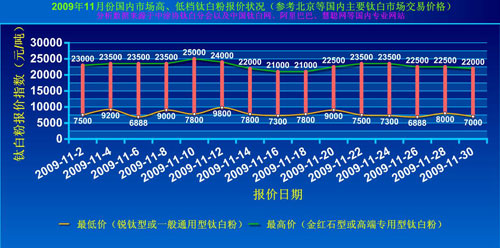 2009年11月份國內(nèi)高低檔鈦白粉價格走勢,如圖所示,2009年11月初金紅石型鈦白粉基本保持在23000元左右每噸,到2009年11月10號金紅石型鈦白粉價格開始強(qiáng)勢上升,達(dá)到25000元每噸,16日至18日,金紅石型鈦白粉又下降至全月最低價位,2009年11月24日又開始小幅回升與月初基本持平,至月底金紅石型鈦白粉又跌底22000元每噸。2009年11月份金紅石型鈦白粉整體處于平穩(wěn)下滑態(tài)勢。相對于高端鈦白粉市場價格的平穩(wěn)波動,低端銳鈦型鈦白粉價格起伏較為明顯,2009年11月初就從7200元每噸上升至9200元,很快又跌至6888元,如此反復(fù)4個漲跌,月底銳鈦型價格跌至7000元每噸,較月初下降了500元。