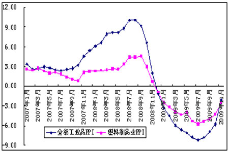 作為當前產能過剩的行業之一,塑料制品業的PPI振幅低于作為綜合指標的全部工業品PPI振幅,但走勢總體上具有一致性,同樣在2009年年中呈現觸底反彈之勢,2010年年初當月同比增長率或將同時由負轉正,塑料產品價格將進一步上揚。