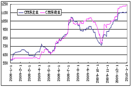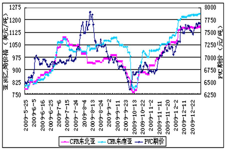 從亞洲乙烯、電石市場價格與PVC期價的走勢對比圖可以看出,上市初期,PVC的比較混亂,脫離基本面情況,四季度隨著乙烯法PVC和電石法PVC生產成本的共同走高,PVC期價也逐步震蕩上行。2010年國際油價和亞洲乙烯仍將繼續走高,煤價保持漲勢,電價較往年上調,乙烯法PVC和電石法PVC的生產成本都將繼續增加,對PVC期價形成支撐。