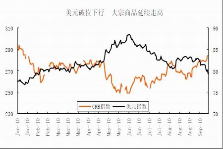 從美國近期的經濟形勢來看,數據依舊好壞不一,總體偏差。在部分刺激計劃終止之后,美國經濟年初的強勁復蘇勢頭已不再,二、三季度以后公布的經濟數據多數令人失望,二季度GDP 大幅回落至1.6%,新房銷量跌至危機以來的新低,就業市場也不見好轉,每周失業人數維持在44 萬~47 萬之間,非農就業人數在短暫好轉之后再度陷入負增長,整個形勢依舊不容樂觀。筆者認為,鑒于美國經濟復蘇步伐十分緩慢,特別是失業率高居不下,在奧巴馬政府即將面臨中期選舉的關鍵時刻,進一步出臺量化寬松政策的可能性仍是比較大的,從近期美國要求人民幣升值的態度以及美聯儲最近議息會議后的申明均可見一斑。在此背景下,美國經濟“二次探底”的風險應該說相當小,復蘇的進程仍將維持。加上美元在進一步量化寬松預期下有進一步下行的可能,國際大宗商品在年內仍將高位運行。
