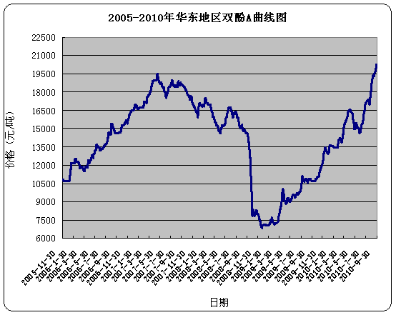 華東地區雙酚A產品報價自2010年月起就呈現強勢上升趨勢,雖偶有小幅下滑,但整體上升形勢未有改變。進入9月以來,價格更是一路飆升,屢次突破近年歷史最高,至9月底已破突20000元/噸的大關。 據最新了解的數據顯示,華東地區雙酚A市場價格已大幅推漲至21000元/噸上下,雖市場現貨不多,但綜合華東地區雙酚A市場整體趨勢,雙酚A市場前景明朗。