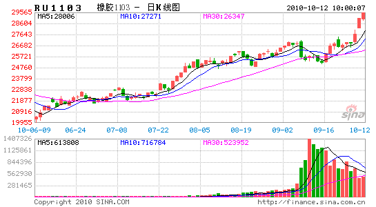 10月12日早盤,國內期貨市場多數下跌,橡膠逆勢表現亮眼。橡膠1103合約繼昨日漲停之后,今日早盤持續走高,截至10:03,該合約漲2.61%,報29485元,盤中一度漲至29565元,創下4年多新高。