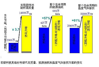 若塑料被其他材料替代,則所需消耗的材料質量、能源消耗以及溫室氣體排放都將顯著增長