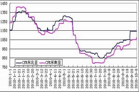 三季度亞洲乙烯自低位反彈走高,現收于1140.5-1142.5美元/噸CFR東北亞和1070.5-1072.5美元/噸CFR東南亞,比6月底分別上漲240美元和212美元。裝置方面,臺灣臺塑乙烯產能70萬噸的1號裂解裝置重啟推遲至10月中旬,乙烯產能103萬噸的2號裂解裝置檢修也推遲至10月中旬;CPC乙烯產能38萬噸的4號裂解裝置11月關閉檢修50天左右;PTT乙烯產能138萬噸的裂解裝置目前開工率60-70%,四季度將達到滿負荷;泰國羅勇乙烯產能80萬噸的裂解裝置將于11月中下旬進行例行檢修;中東博祿產能150萬噸的乙烯裂解裝置目前已工業化生產。盡管臺灣地區貨源緊張局面仍將延續到臺塑恢復生產,但整體看來后期市場供應壓力將逐漸增大,亞洲乙烯價格后市將趨于平穩。