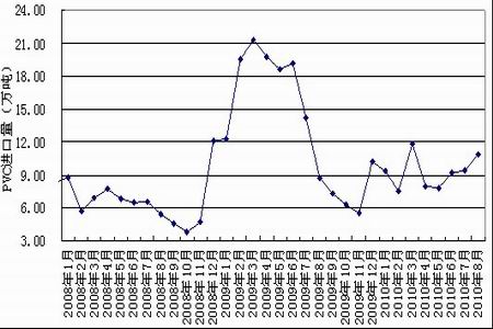 2010年8月中國大陸PVC粉樹脂進口量為10.9萬噸,環比增加15.76%,同比增加24.84%;1-8月累計進口量為74.13萬噸,同比減少44.54%。