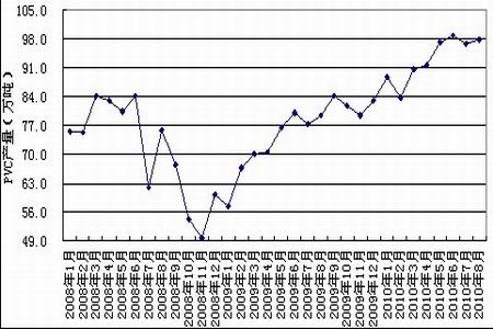 2010年8月國內PVC產量為97.9萬噸,環比增加1.13%,較去年同期增加11.3%。1-8月累計產量為744.3萬噸,較去年同期增加15.5%。