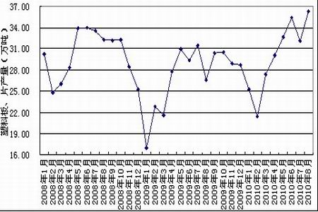 2010年8月國內塑料型材產量為36.1萬噸,同比增長39.9%;1-8月份累計產量為239.8萬噸,同比增長16.7%。