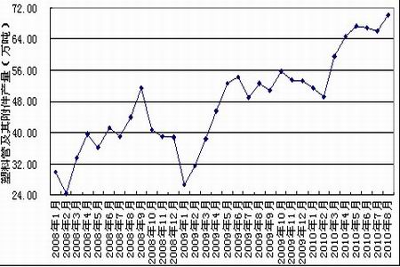 2010年8月國內塑料管及其附件產量為70.6萬噸,同比增長29.8%;1-8月份累計產量為483.1萬噸,同比增長28.4%。