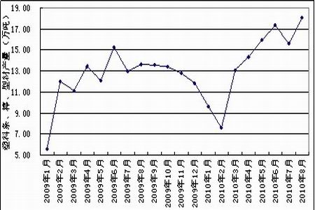 2010年8月國內塑料條、棒、型材產量為17.8萬噸,同比增長22.8%;1-8月份累計產量為114.0萬噸,同比增長7.8%。