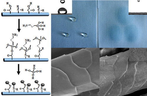在此研究基礎之上,該團隊以實際應用為導向,利用表面接枝和原位生長的策略,在羊毛纖維表面原位生長了直徑為20納米的二氧化硅納米薄層。所得織物參照國家標準進行檢驗,滿足了“吸濕速干”型功能面料的各項指標。另外,機洗20次之后,這一特性仍能很好的保持,解決了目前納米功能面料耐洗性不夠的難題。而且,原位生長的策略大大精簡了制備的步驟,為構建納米功能面料提供了新的思路。