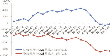 棉價的持續猛漲使得粘膠短纖、滌綸短纖的替代作用明顯增強,市場對粘短、滌短的需求增大。從二者對棉花的價差來看,2010年1~5月每噸粘膠短纖價格比328級棉價高出3000元左右,6月份之后,棉價猛漲使得二者價差不斷縮減,9月粘膠短纖均價已比328級棉價低了400元/噸左右。在滌綸短纖方面,2010年前5月,滌綸短纖價格比328級棉價每噸低5000元左右,但6月至今,二者價差擴大至8000元/噸,滌短的替代作用同樣不斷增大。