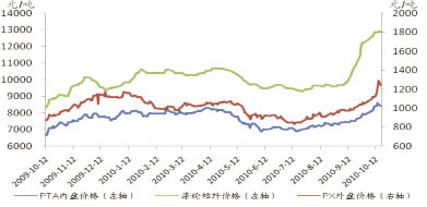 滌綸短纖價格方面,一方面在于棉價的影響,另一方面則在于滌短自身上游產業鏈的推動。在美國商業原油庫存下降、美元指數大幅下探等因素的影響下,國際原油價格回升明顯。9月29日,NYMEX原油期貨1101合約突破80美元/桶,漲至80.15美元/桶,此后繼續上行震蕩,10月18日則收盤于84.49美元/桶。而受原油價格提振,PTA主力1101合約一改6、7、8月份每噸在7200元~8000元價格區間內的盤整狀態,9月及10月上旬行情上升明顯,10月18日PTA則漲至8658元/噸。現貨價格方面,10月18日PTA內盤價格漲至8420元/噸,外盤價格則漲至1070美元/噸,較8月2日價格分別上漲了14.49%、18.69%;10月18日PX外盤價格則漲至1243美元/噸,較8月初上漲了28.40%。相比較而言,PX、PTA的漲幅均小于棉短絨、棉漿的漲幅。10月18日,滌綸短纖價格則漲至12900元/噸,較8月2日價格大幅提高了3420元/噸,漲幅則達到了36.08%。