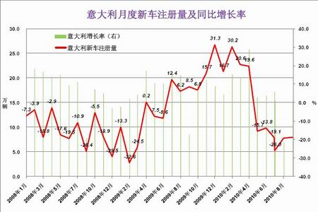 圖2-14 意大利汽車月度新車注冊量 單位:萬輛 %