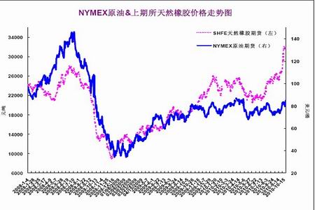 圖4-1 紐約原油與滬膠走勢圖 單位:美元/桶 元/噸