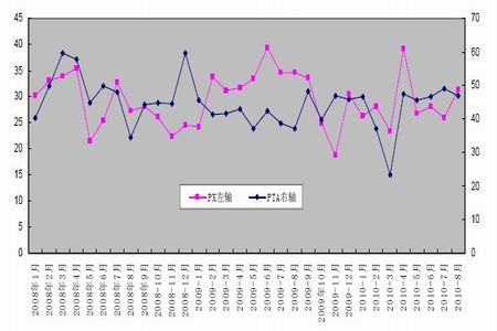 2010 年8 月份PTA 進(jìn)口量469245.611 噸,累計(jì)總數(shù)量為3673193.306 噸,當(dāng)月金額在39497.01 萬(wàn)美金,累計(jì)總金額在335745.36 萬(wàn)美金,當(dāng)月進(jìn)口均價(jià)為841.71 美金/噸,累計(jì)均價(jià)為914.04 美金/噸,環(huán)比增-4.14%,同比增26.33%,與上年同期數(shù)量相比增12.30%。