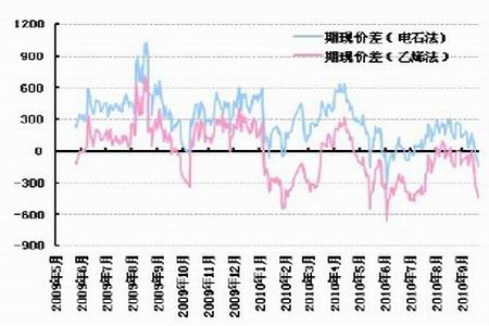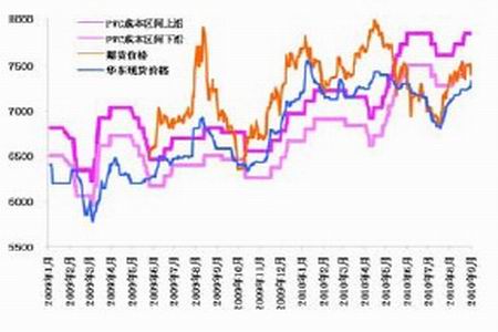 9 月份國家宏觀調(diào)控適度放松,政策面沒有太多的消息出臺,商品整體呈現(xiàn)高位震蕩局面。PVC 方面受節(jié)能減排工作影響,部分地區(qū)出現(xiàn)拉閘限電現(xiàn)象,上游電石開工率下降市場貨源減少,電石價(jià)格一路上漲,拉動(dòng)PVC 現(xiàn)貨價(jià)格暴漲,一個(gè)月時(shí)間內(nèi)價(jià)格平均上漲7000元/噸,漲幅接近10%。期貨方面受股市及整體金融環(huán)境走弱制約,漲幅小于現(xiàn)貨,出現(xiàn)期現(xiàn)倒掛情形。