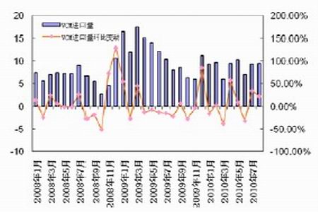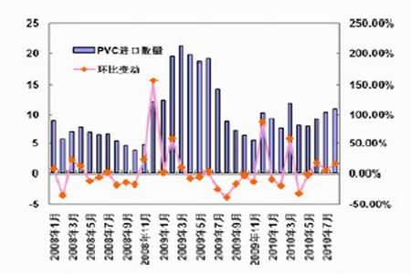 2010 年8 月PVC 進(jìn)口量為10.9 萬噸,均價(jià)為926.21 美元/噸,比上月數(shù)量增加15.76%,和去年同期相比增加24.84%;1-8 月累計(jì)進(jìn)口數(shù)量為74.13 萬噸,同比減少44.54%。