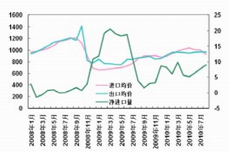 2010 年8 月PVC 出口均價(jià)963.92 美元/噸,進(jìn)口均價(jià)926.21 美元/噸,進(jìn)口均價(jià)反超出口價(jià)格,凈進(jìn)口數(shù)量小幅回落。