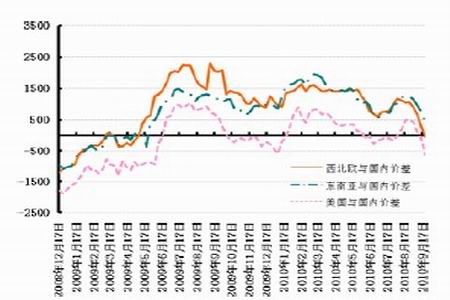 國內(nèi)外兩個(gè)市場走勢迥異,與國內(nèi)走勢強(qiáng)勁相反,國際市場PVC 價(jià)格繼續(xù)走弱,其中歐洲、北美地區(qū)下跌30-50 美元/噸,亞洲地區(qū)變動(dòng)較小,較7 月末上漲10 美元/噸。歐美地區(qū)貨源進(jìn)口完稅價(jià)低于國內(nèi),國際貨源重返低價(jià)時(shí)代。