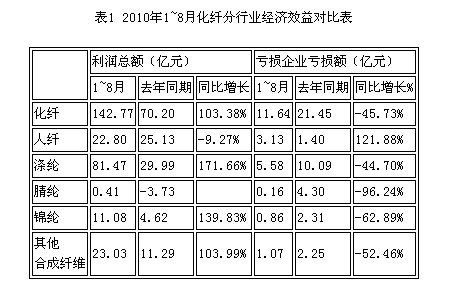 據(jù)國家統(tǒng)計局統(tǒng)計,1~8月,化纖行業(yè)實現(xiàn)利潤總額142.77億元,同比大幅增長1倍,虧損企業(yè)虧損額11.64億元,大幅下降45.73%;全行業(yè)虧損面13.42%,同比減少了6.37個百分點。