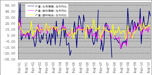 盡管存在節假日消費因素,10月份4.4%的CPI水平已經成為政府關心的重點。為控制冬季以及春節期間物價水平,政府已經開始進行相關政策補貼的傾斜,如對南方農區進行每畝200元的補貼。而冬季蔬菜價格波動率明顯增強,是一籃子物價水平中較難控制的一個部分(圖2)。因此,反季節農作物種植面積以及規模的增加將明顯延續,并進一步提升農膜需求。10月份農膜產量15.10萬噸,同比增幅高達37.3%,遠高于同期包裝膜18.6%和塑料制品17.04%的同比增速(圖3)。這表明農膜需求可能將繼續維持高位,從而提升LLDPE需求。
