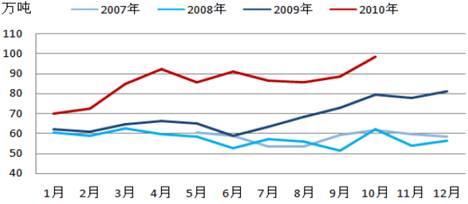 圖4:2010年PE月度產量明顯高于往年水平 單位:萬噸