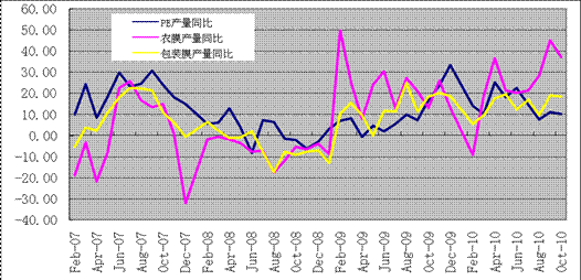 2010年PE月度產量數據表明,LLDPE供給一直保持充裕狀態,月度產量明顯高于往年水平(圖4)。10月份PE產量再創年內新高,達到98.4萬噸,同比增幅22.1%,1—10月份累計產量863萬噸,同比增幅31.8%。10月份塑料制品產量525.88萬噸,同比增長17.04%,1—10月份累計產量4636萬噸,同比增幅25.9%。