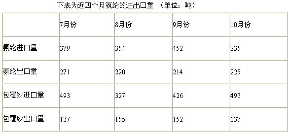 從近幾個月的氨綸進出口量來看,10月份最新的氨綸進口量為235噸,出口量為225噸,氨綸包覆紗的進口量為493噸,出口量為137噸。這些數據與前幾個月對比來看,10月份的氨綸進口量大幅減少,與9月份相比,下降了217噸,下降幅度達到了48%,近一半,這個數據顯示,國內氨綸對國外氨綸的需求量在大幅減少,減少的原因可能有幾點:國內氨綸下游織造企業目前的形勢不容樂觀,所以對氨綸的整體需求在減少;進入秋冬季節,在夏季對各地氨綸廠商的限電停產工作逐漸恢復,各氨綸企業的開機率普遍上升,所以國內的氨綸供需開始達到了平衡,對氨綸的進口量就急速減少。下表的一些其他進出口數據都與前三個月基本接近。