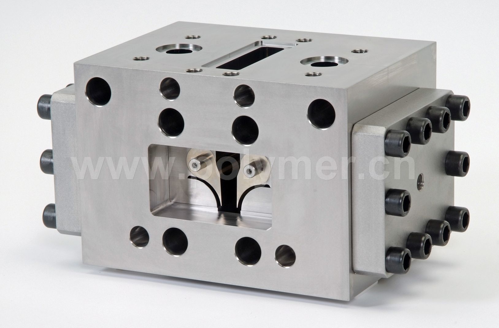 PHOTO: Ultraflow® V喂料塊。與舊型號相比,新型Ultraflow® V薄膜及片材復合共擠喂料塊不再使用流體插件。喂料塊中間凹陷部位是兩塊合流板(截面為水滴形),合流板中間是中央流道。合流板處于自由活動模式時,其位置則根據來自擠出機的熔體平衡壓力而定。另外,合流板裝有中心軸,可進行人工調節,以優化層間界面。