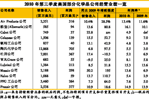 迄今為止,在發布季報的化學品公司中,大多數公司的季度銷售額同比增長了10%~20%,而它們的贏利則大幅飆升。美國空氣化工產品有限公司(Air Products & Chemicals)、雅寶(Albemarle)公司、Cabot公司、Celanese公司、氰特工業(Cytec Industries)公司、陶氏化學公司、格雷斯(W.R. Grace)公司、路博潤(Lubrizol)公司、納爾科(Nalco)公司、PPG工業(PPG Industries)公司和普萊克斯(Praxair)公司的經營業績幾乎與它們在今年第二季度的業績相同,當時整個行業跳出了經濟衰退的低谷。