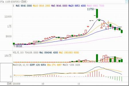 11月初,受美國新一輪刺激計劃出臺,棉花價格暴漲引發(fā)棉纖替代炒作,以及部分主流供應商因裝置故障導致合同減量的提振,PTA現(xiàn)貨飆升至11500元/噸;鄭州PTA期價出現(xiàn)連續(xù)漲停,1105合約最高觸及11750一線。中下旬,在國內(nèi)持續(xù)緊縮流動性、物價調(diào)控力度加碼等預期的壓制下,PTA展開深幅調(diào)整走勢,PTA1105合約逐步回落至9300元/噸一線。