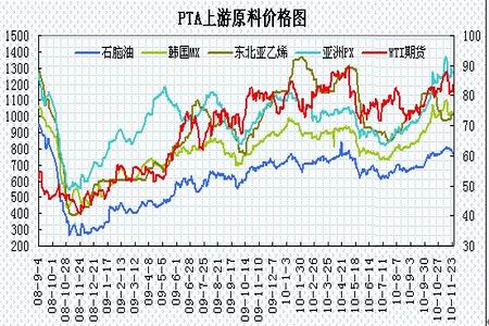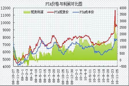 PTA現貨市場上演大起大落行情,月初部分主流供應商因裝置故障導致合同減量,以及棉纖替代效應引發滌綸纖維大幅上漲,這激發PTA市場炒作熱情。現貨市場賣方屢屢封盤不報,成交價位大幅攀升。內外盤現貨價格自月初的8600元、1070美元大幅上漲至最高時的11500-11600元、1400美元/噸甚至以上。同時因PTA現貨漲速明顯快于PX,動態的生產利潤也繼續大幅上升。中下旬,在國家緊縮調控以及原油回落的壓制下,現貨市場逐步回落,截止11月26日,PTA內盤持貨方報盤在9350元/噸附近,主流商談在9250-9300元/噸附近展開,實盤稀少。亞洲PTA現貨市場氣氛低迷,現貨買賣雙方持觀望態度,少量臺貨商談在1155-1160美元/噸附近,韓國貨商談在1145美元/噸附近。
