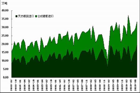 圖為中國(guó)天然橡膠、合成橡膠進(jìn)口量走勢(shì)圖。(圖片來(lái)源:上海中期)